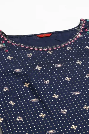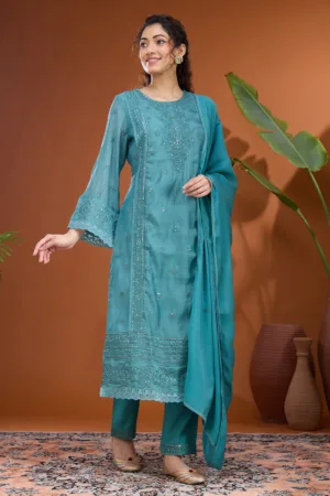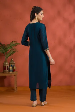 Peacock Blue Threadwork Raw Silk Readymade Salwar Suit