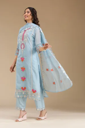 Sky Blue Threadwork Semi Crepe Readymade Salwar Suit