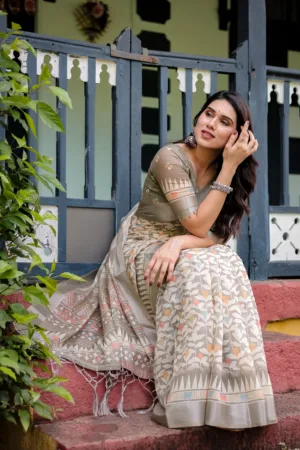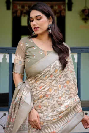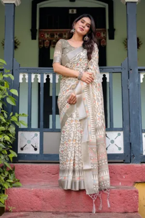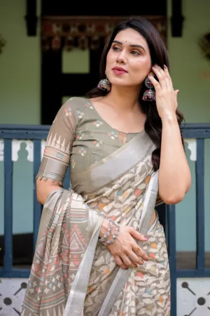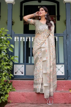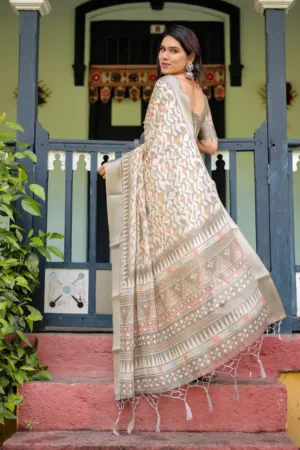 This stunning pure cotton linen saree features a subtle beige base adorned with a mix of geometric patterns and delicate leaf motifs in shades of orange, blue, and soft pastels. The pallu showcases intricate geometric detailing, adding a touch of elegance. Comes with a matching blouse and tassels on the saree’s edges, making it perfect for traditional and festive wear.