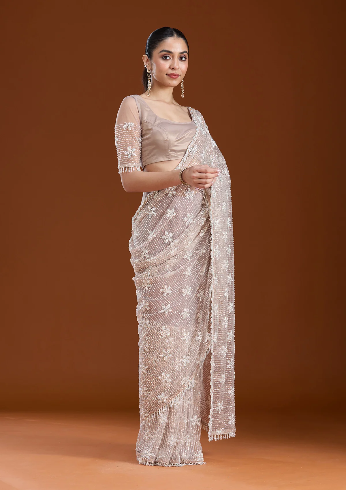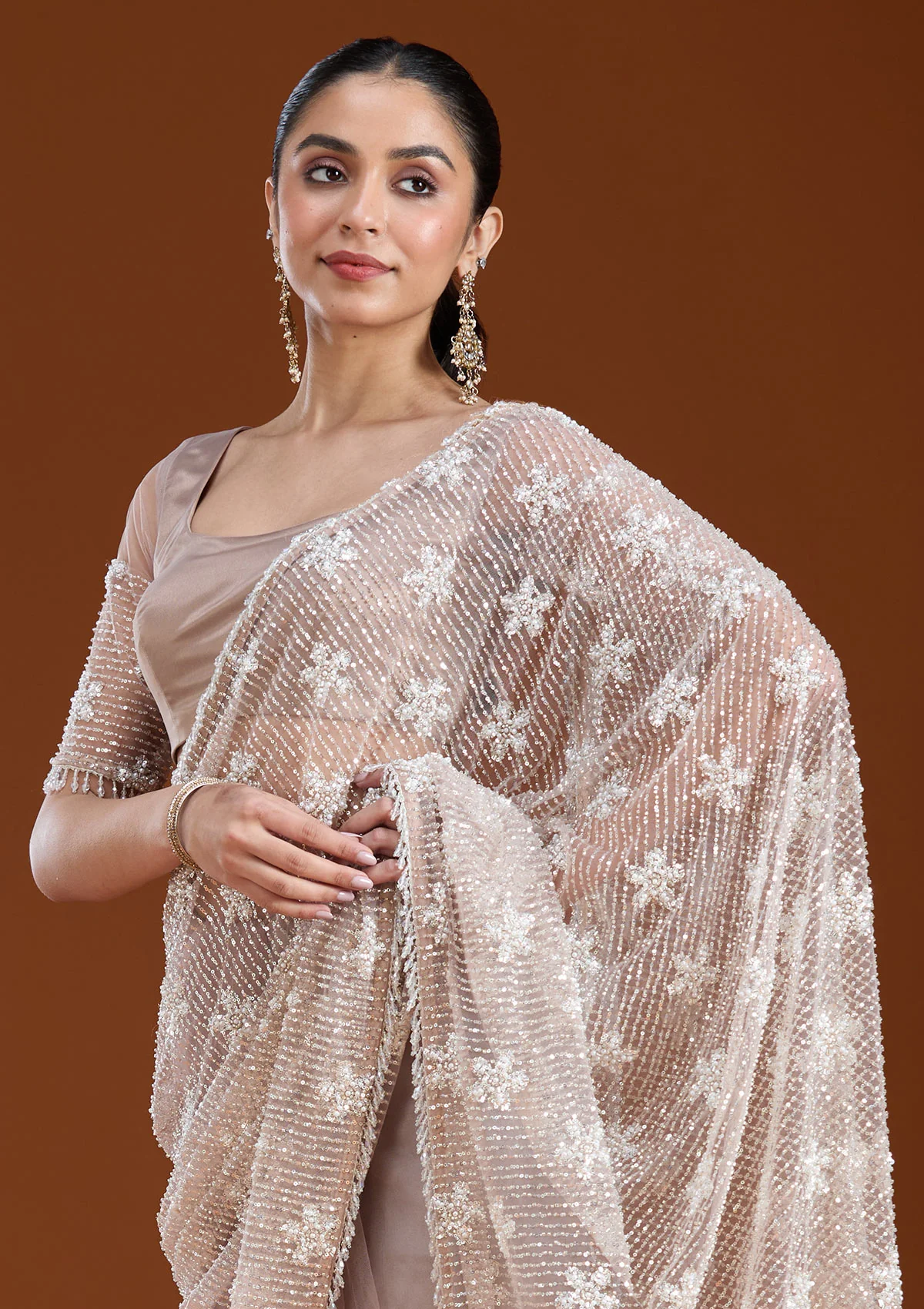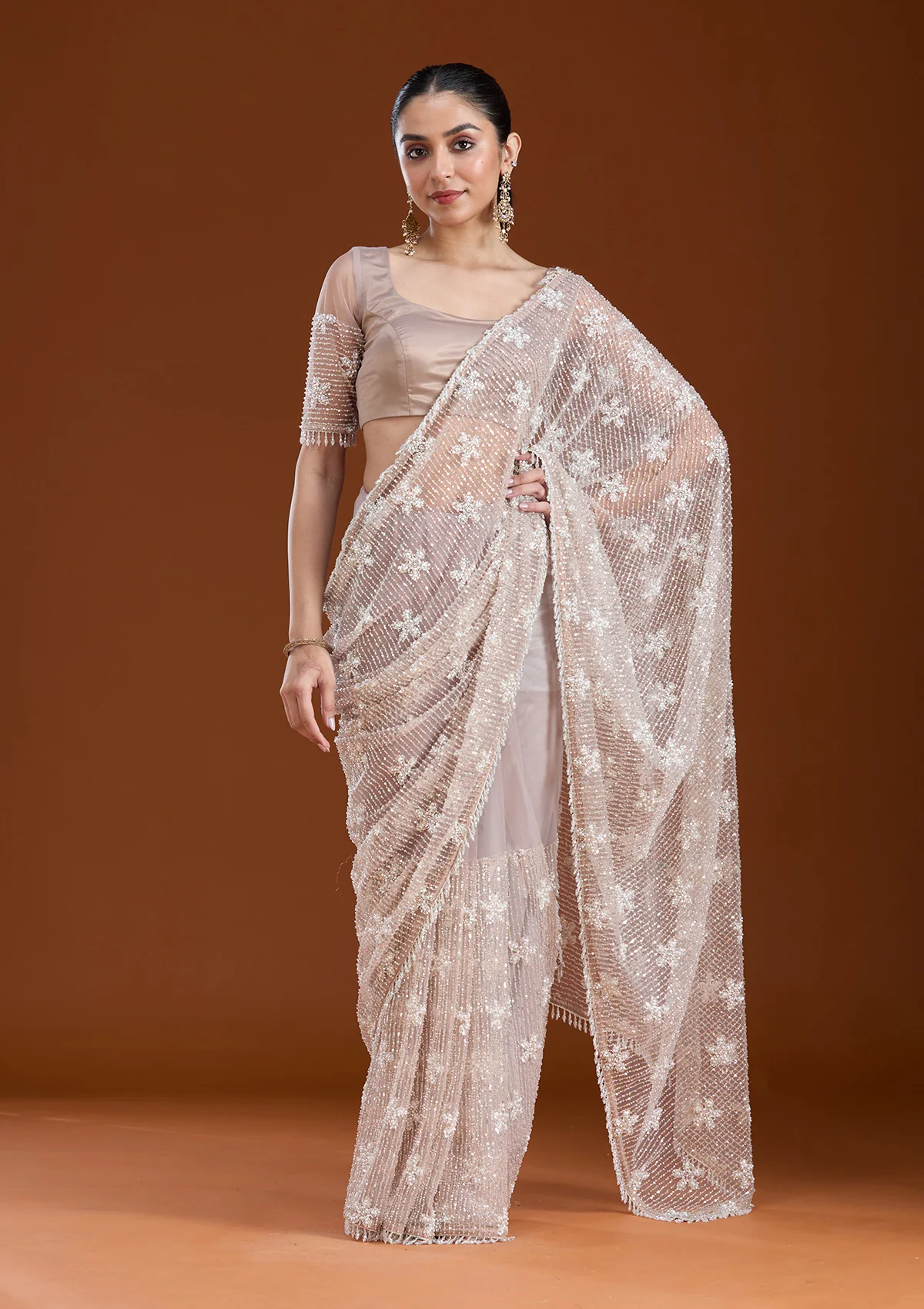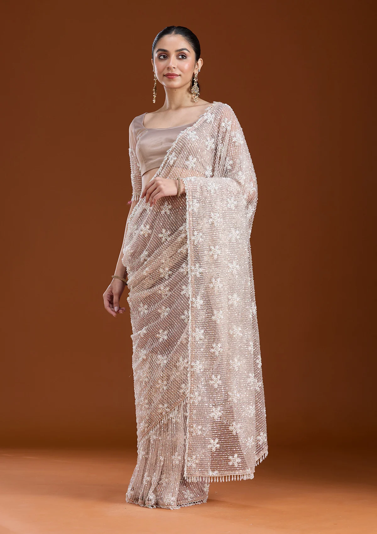 Beige Saree in Net fabric. The Saree is elevated with Sequins embroidery. It comes with an Unstitched blouse. Comes with the Mimosa promise of premium quality.