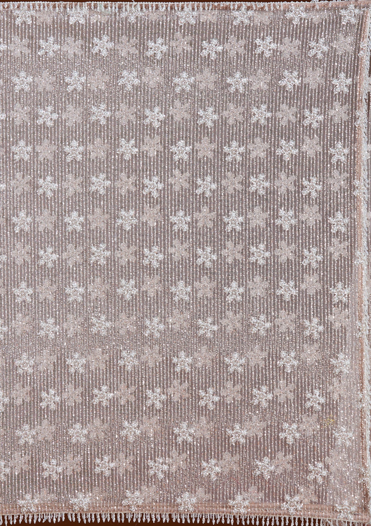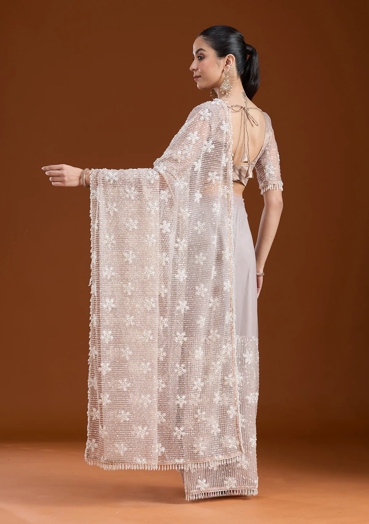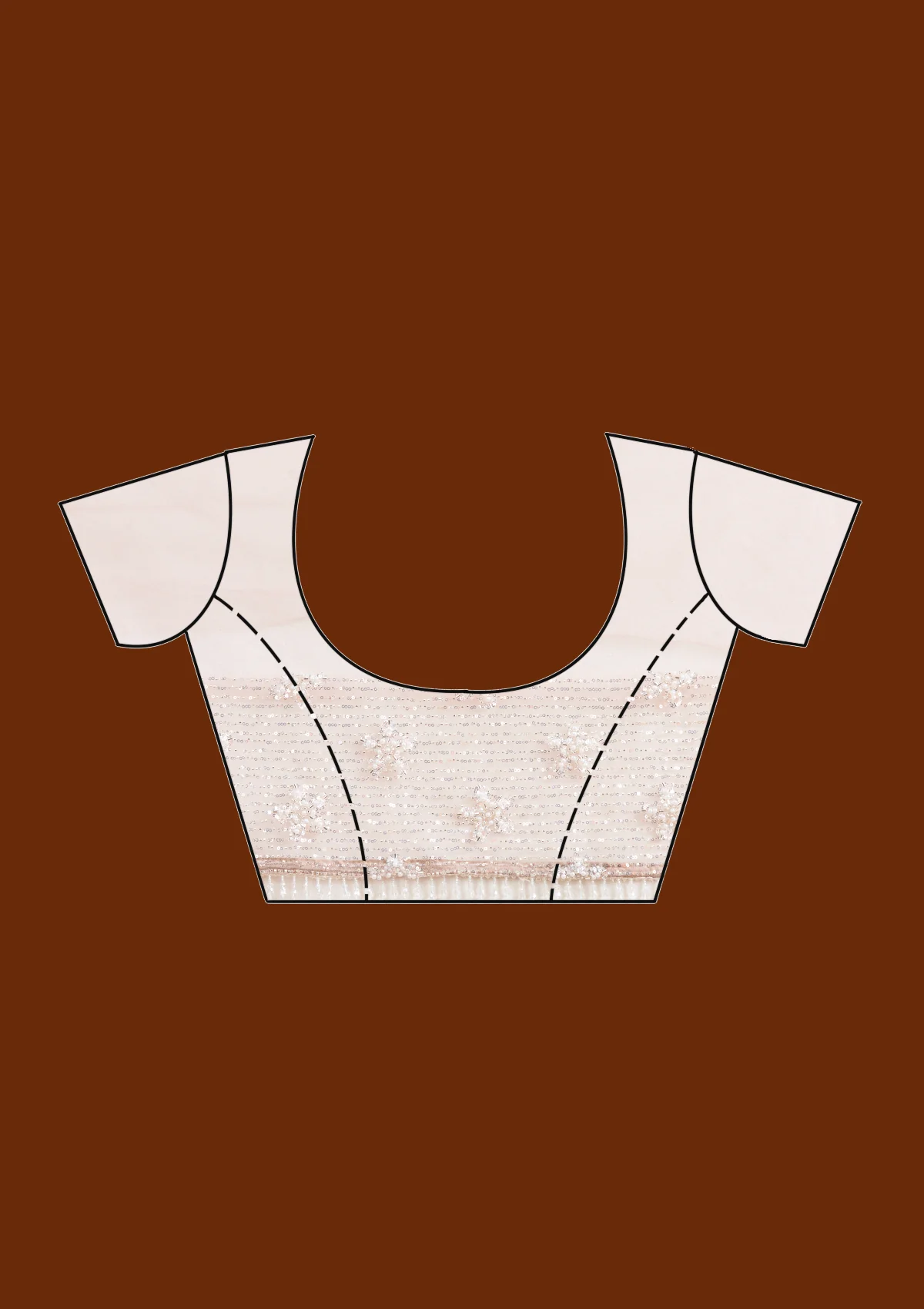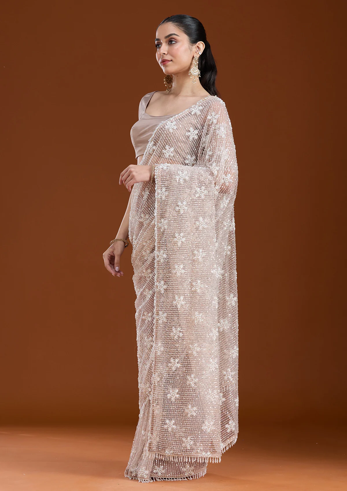 Beige Saree in Net fabric. The Saree is elevated with Sequins embroidery. It comes with an Unstitched blouse. Comes with the Mimosa promise of premium quality.