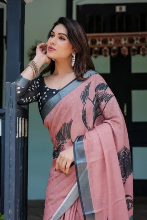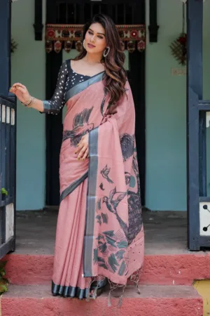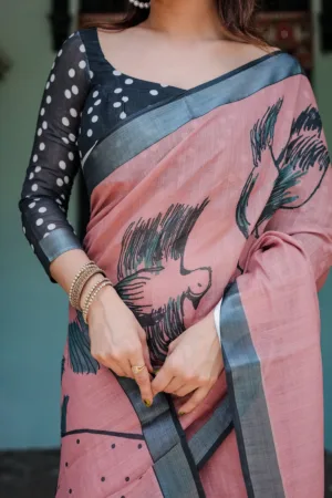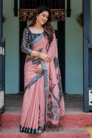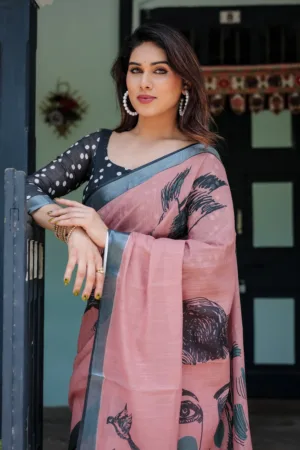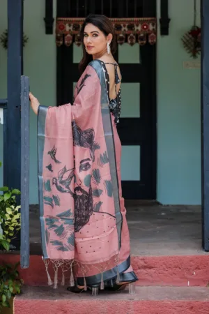 This elegant blush pink pure cotton linen saree features intricate black bird motifs that evoke a serene, nature-inspired aesthetic. Complementing the soft tone is a sleek charcoal grey border, adding sophistication to the overall look. The saree comes with a chic polka dot blouse in black and white, perfectly blending modern and traditional elements. Delicate tassels along the edges complete the ensemble, adding a touch of playful charm. Ideal for day events or casual festivities.