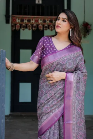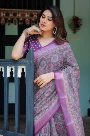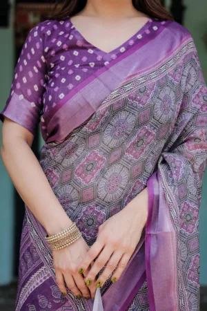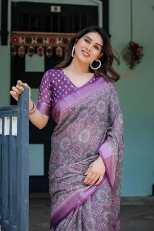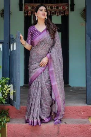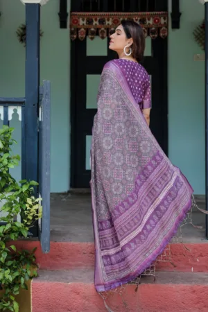 This pure cotton linen saree features a sophisticated purple hue adorned with intricate geometric motifs throughout. The pallu showcases a detailed pattern, bordered with tassels, adding a traditional charm. The saree comes with a matching blouse, and the fabric’s lightweight texture makes it perfect for both casual and festive occasions. The blend of soft tones and intricate designs ensures a timeless appeal for any saree lover.