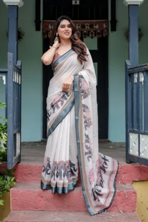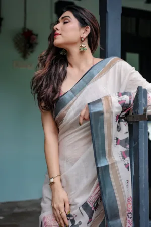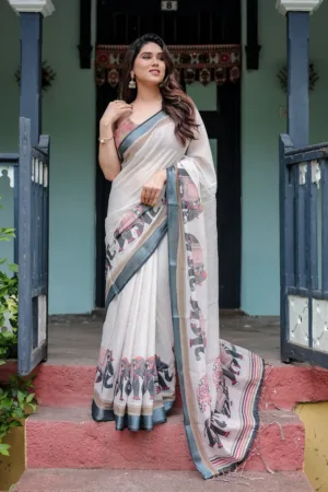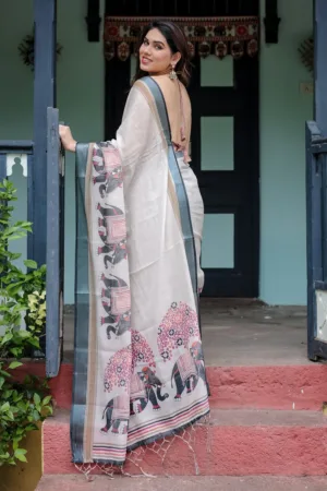 This elegant ivory pure cotton linen saree showcases a traditional yet striking design, featuring detailed elephant motifs in black, adorned with vibrant floral umbrellas in shades of pink and orange. The contrasting charcoal grey border enhances the sophistication of the saree, making it a versatile choice for both casual and festive occasions. The saree comes with a coordinated blouse, completing the look with its contemporary charm. Finished with delicate tassels along the edges, this saree is perfect for those who love a mix of cultural symbolism and modern styling.