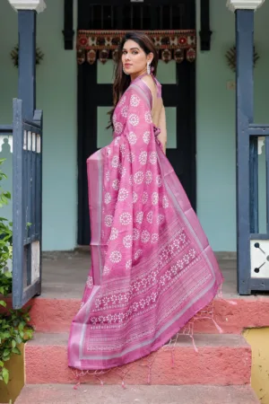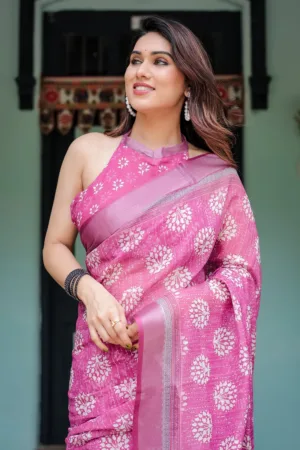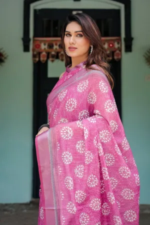 This vibrant magenta pure cotton linen saree features intricate white floral block prints, creating a bold yet elegant look. The pallu is adorned with detailed patterns in a complementary magenta and white combination, giving the saree a traditional yet chic appeal. Paired with a matching blouse, this saree is perfect for festive occasions or cultural events. Tassels along the edges of the pallu add a playful touch, making this saree both stylish and timeless.