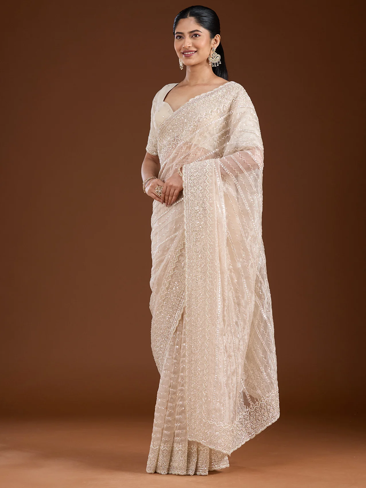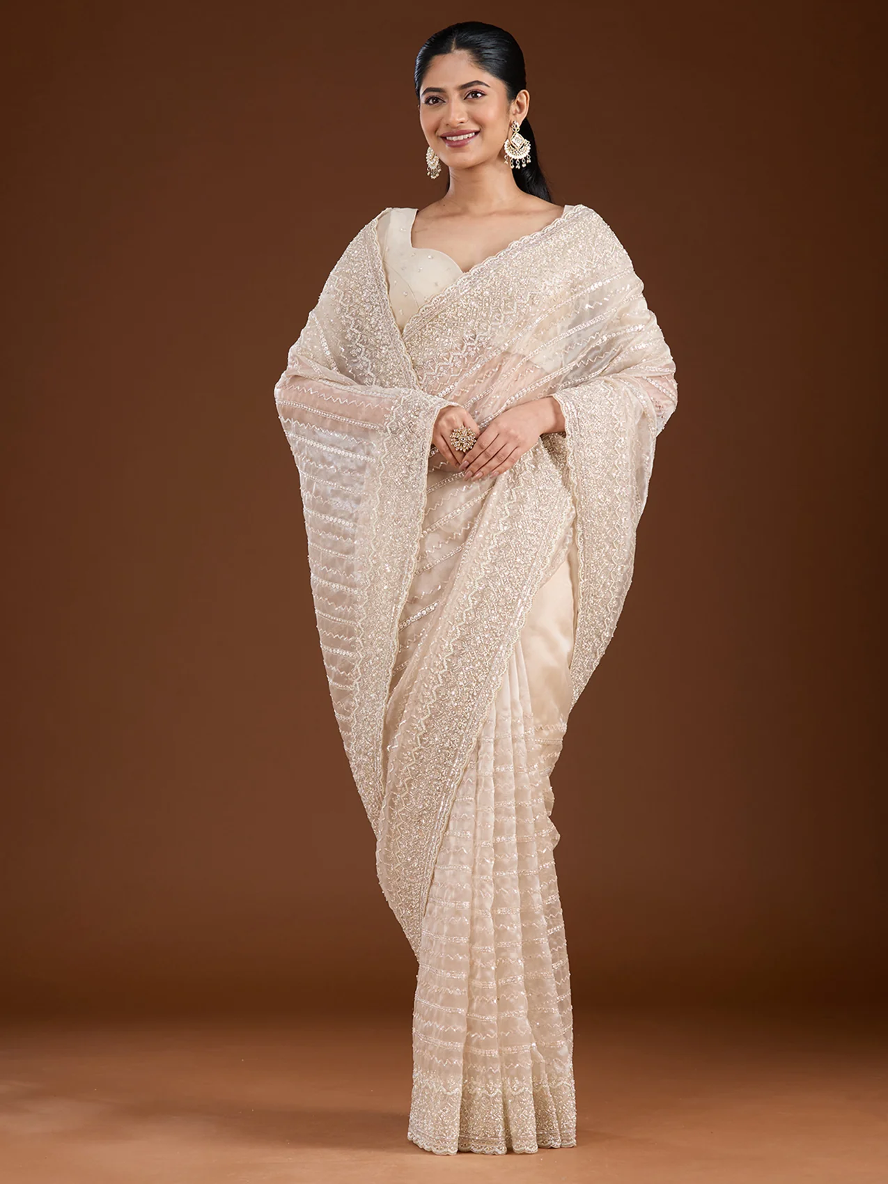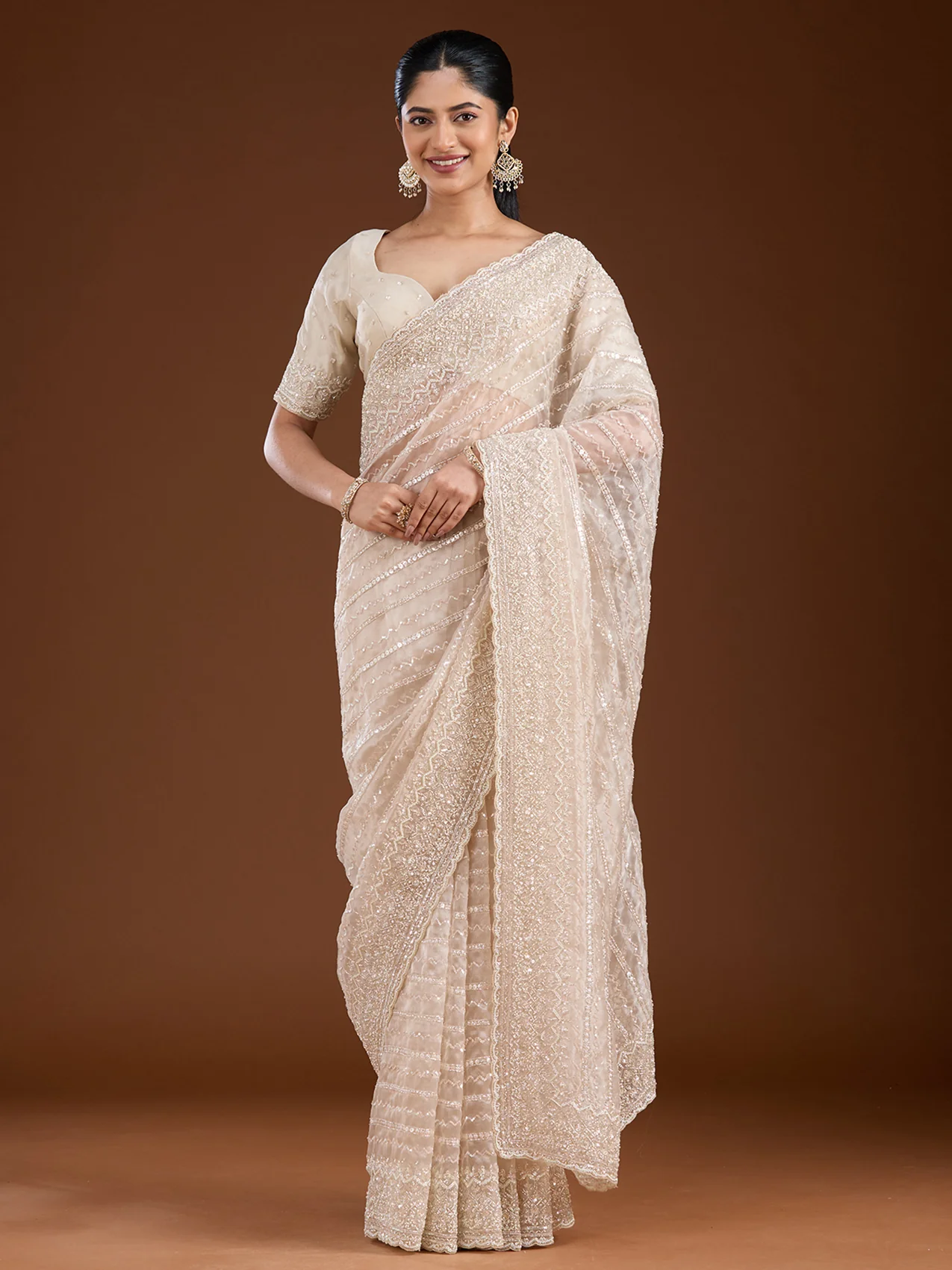 Off White Saree in Net fabric The Saree is elevated with Sequins embroidery It comes with an Unstitched blouse Comes with the Mimosa promise of premium quality.