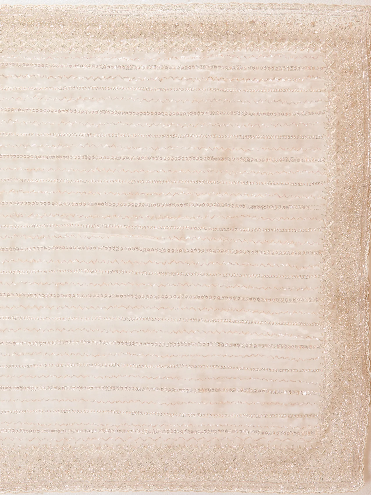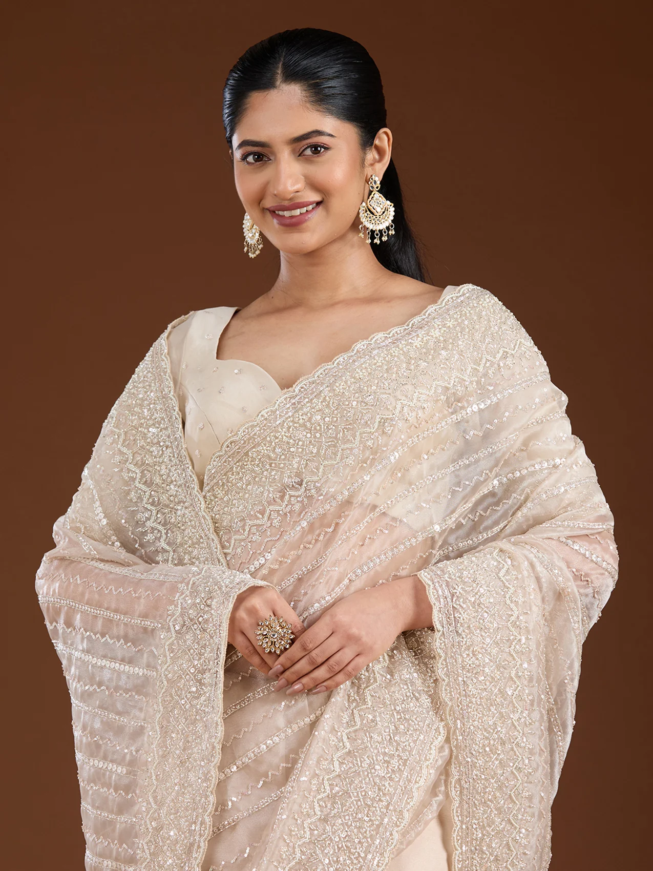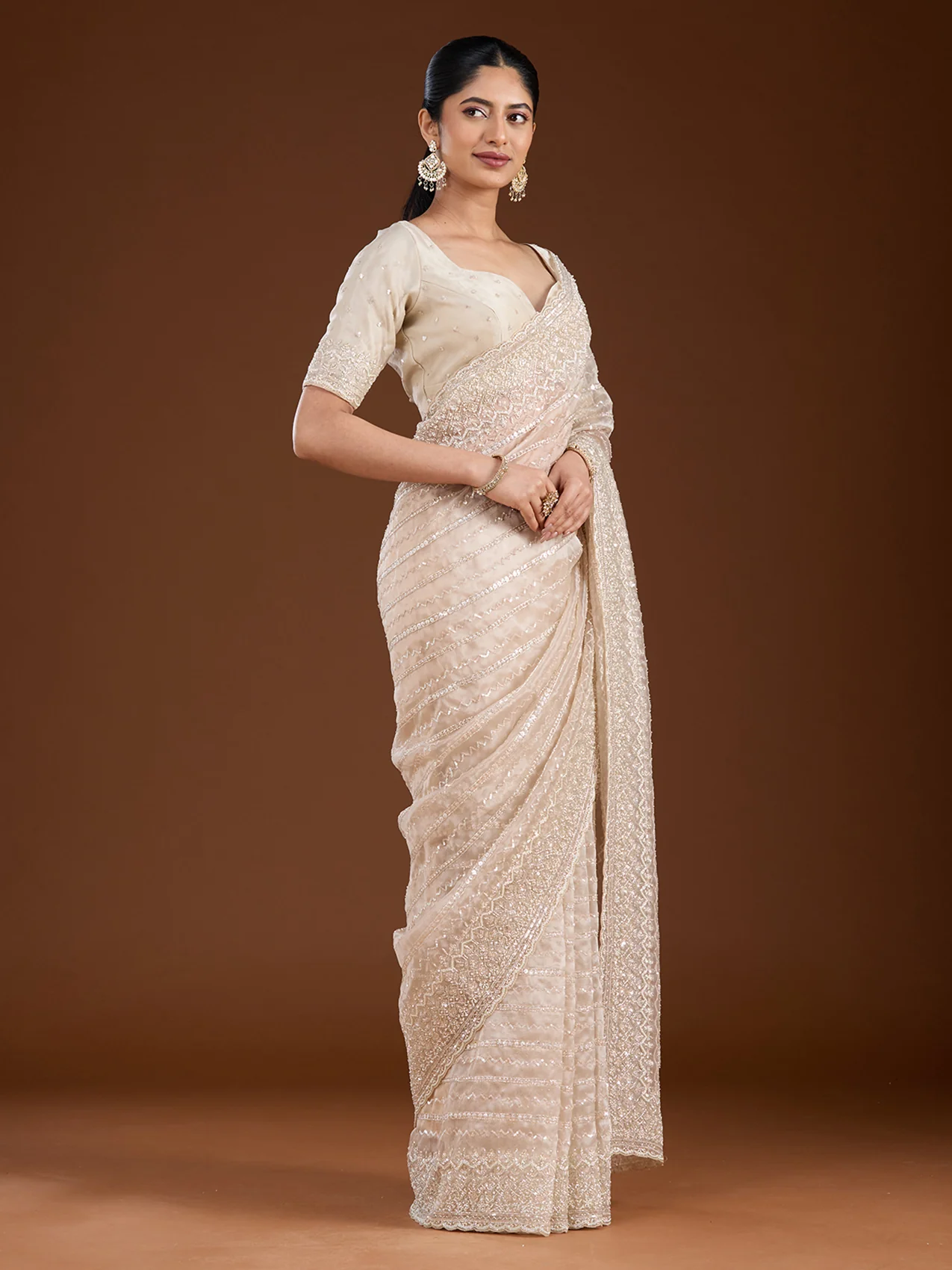 Off White Saree in Net fabric The Saree is elevated with Sequins embroidery It comes with an Unstitched blouse Comes with the Mimosa promise of premium quality.