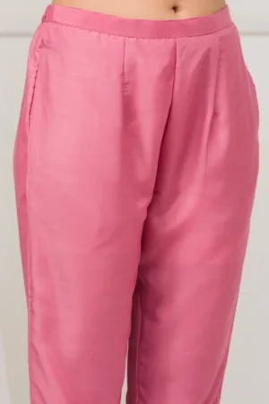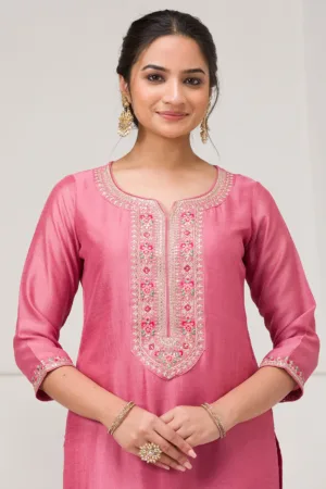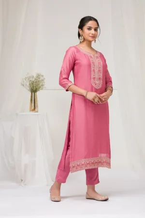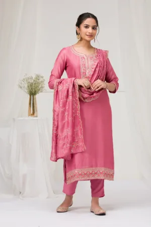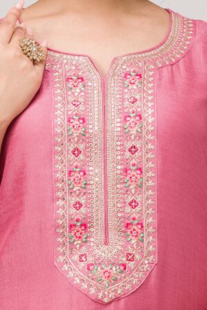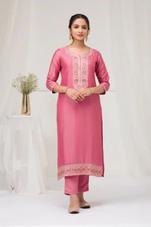 Step into the world of Mimosa where every thread weaves a story of grace and vibrancy! Our pink Soft Raw Silk Salwar Suit exudes a flawless blend of traditional sophistication and contemporary style, complete with exquisite threadwork embroidery that dances across the fabric. This readymade ensemble promises an impeccable fit, ready to infuse your moments with an elegant flair and a playful twist!