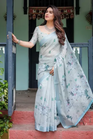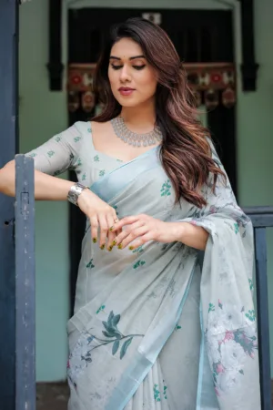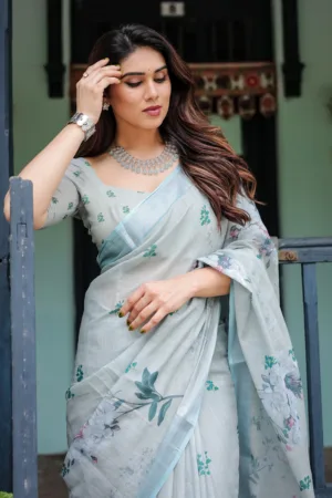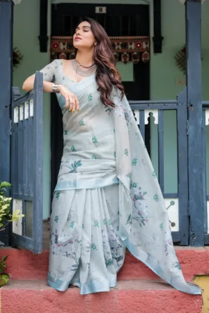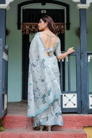 This elegant pastel grey pure cotton linen saree features delicate floral prints in shades of green and blue, evoking a soft, serene charm. The intricate leaf and floral motifs are scattered across the saree, adding a graceful natural touch. The saree is paired with a matching blouse in the same hue for a refined, coordinated look. Finished with tassels along the edges, this saree is perfect for daytime events, casual wear, or intimate gatherings, bringing effortless sophistication to your wardrobe.