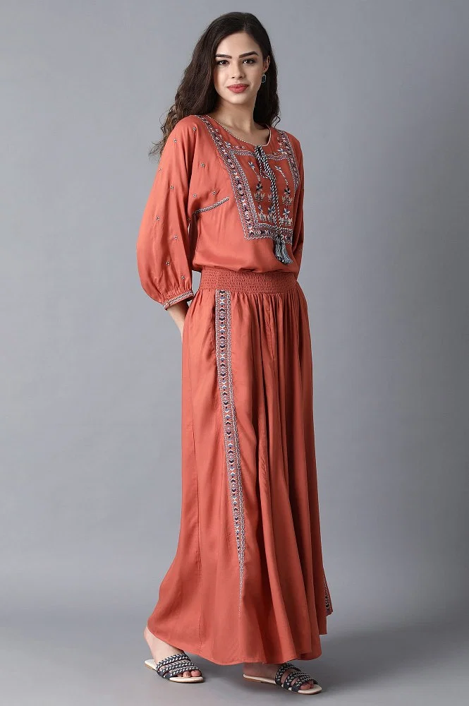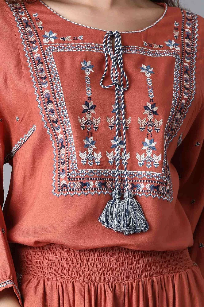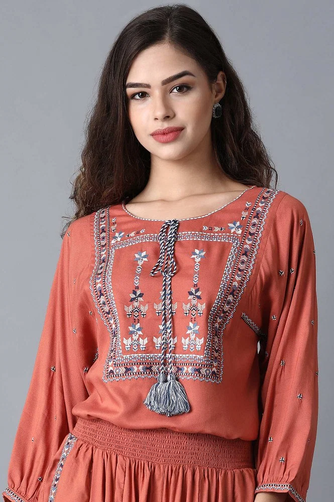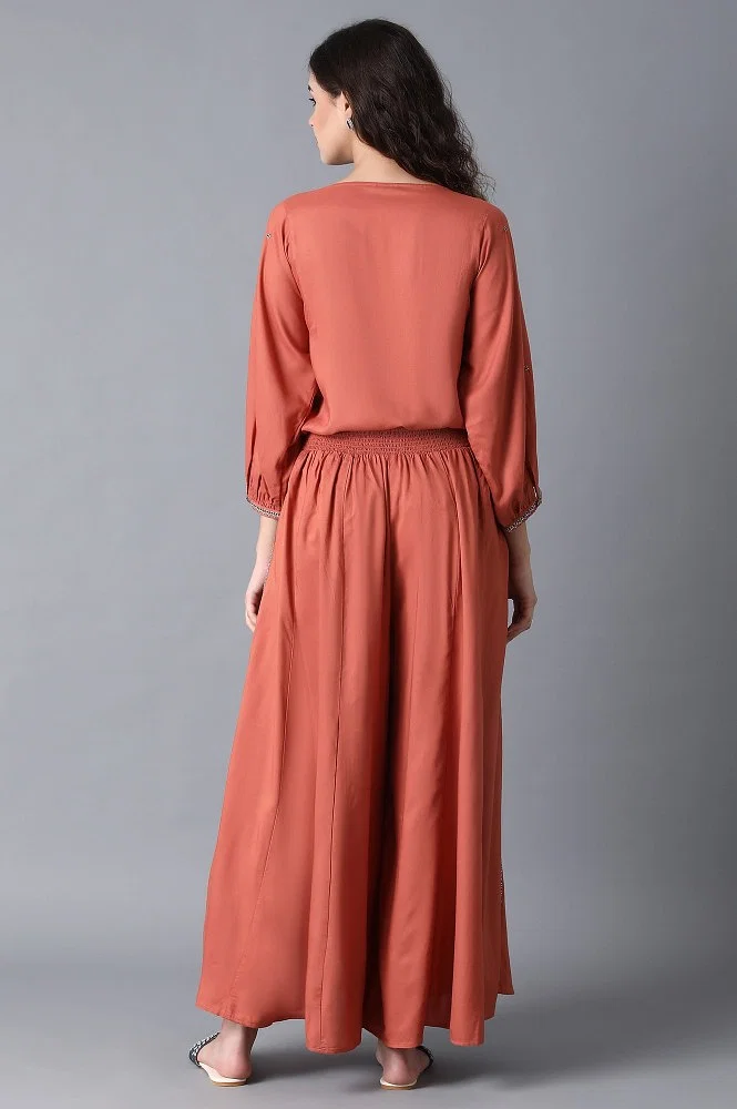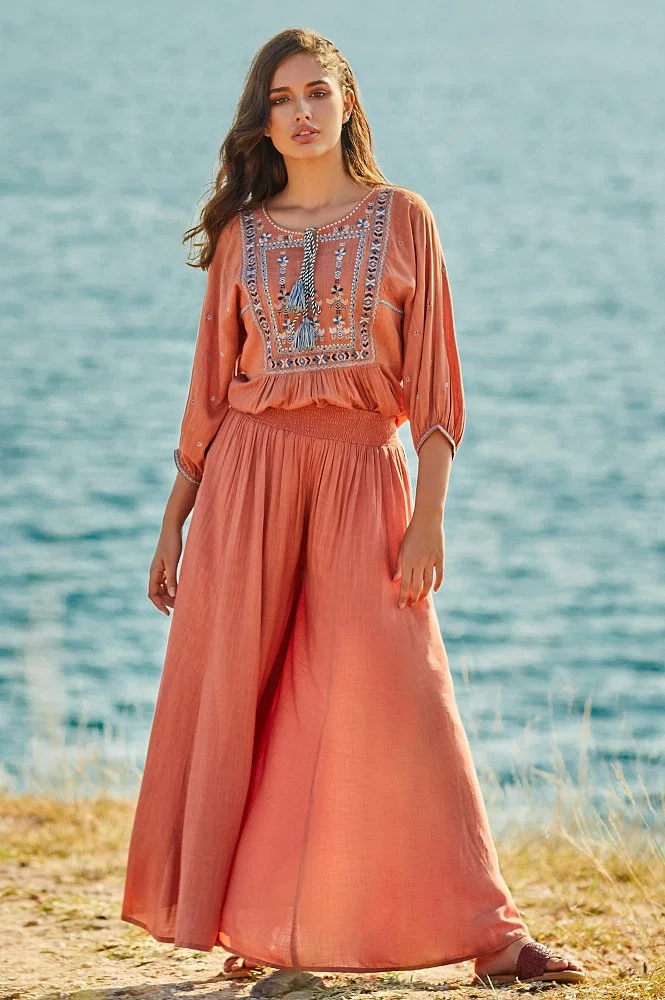 আউটলেটের ঠিকানা দেখুনPeach round neck two piece jumpsuit with embroidered detail. It has a round neck top and flared pants.