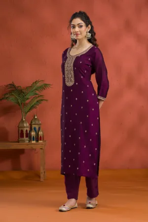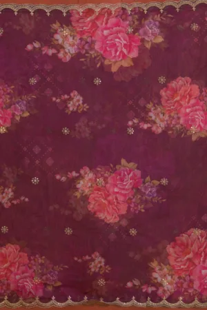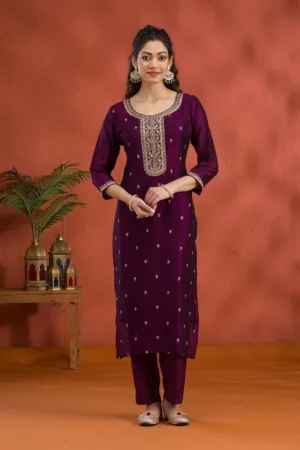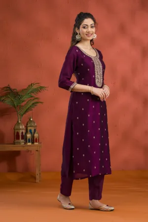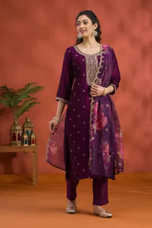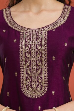 Dive into the splendor of Mimosa’s purple Salwar Suit, crafted in soft raw silk that cascades elegantly over your silhouette. The outfit is artfully adorned with exquisite gold Zari embroidery, radiating a regal charm that’s as playful as it is prestigious. Perfect for those who adore vibrant elegance, this ready-to-wear ensemble promises to be a showstopper at any event!