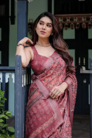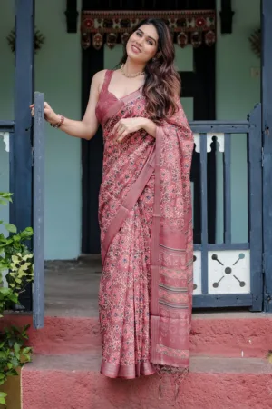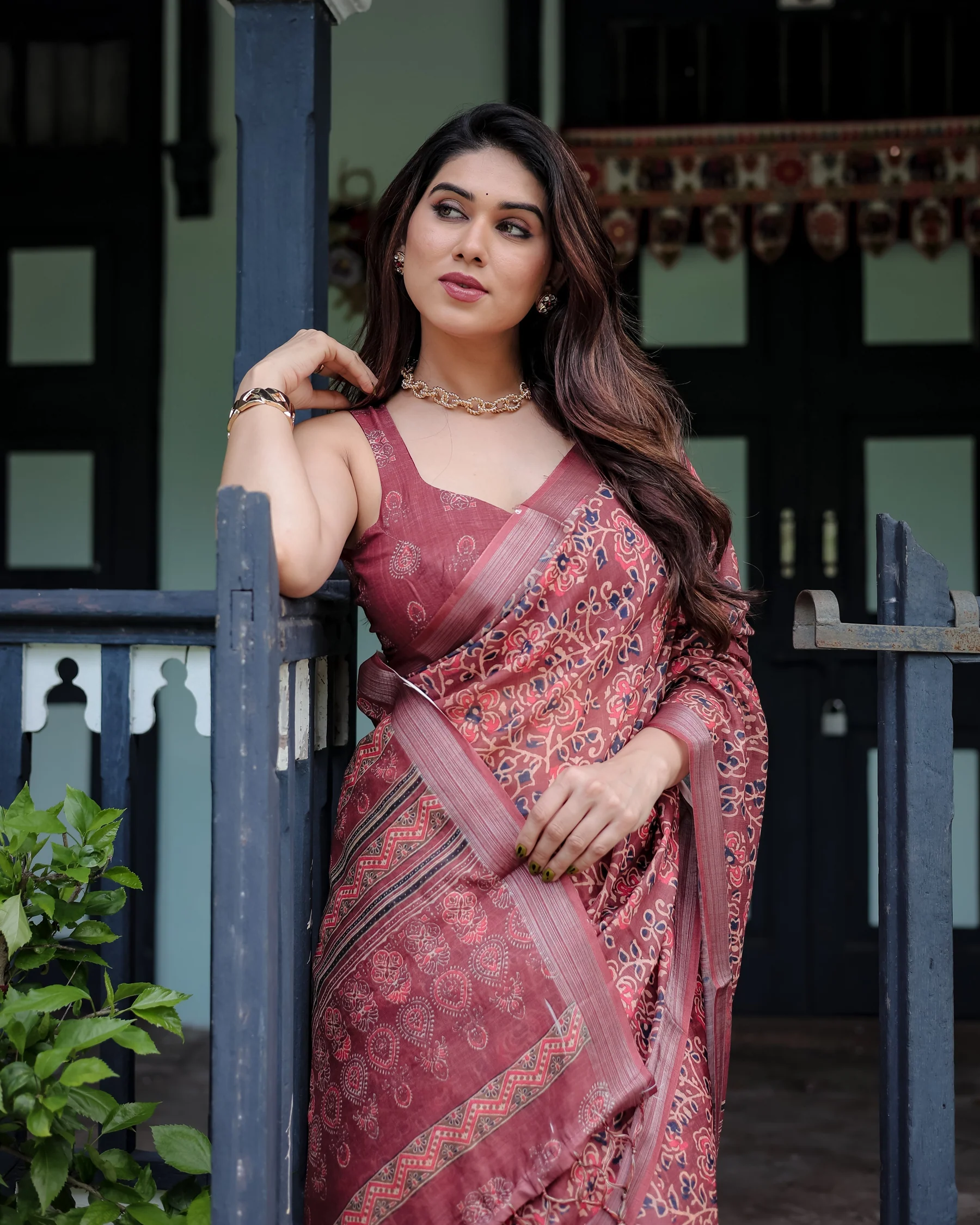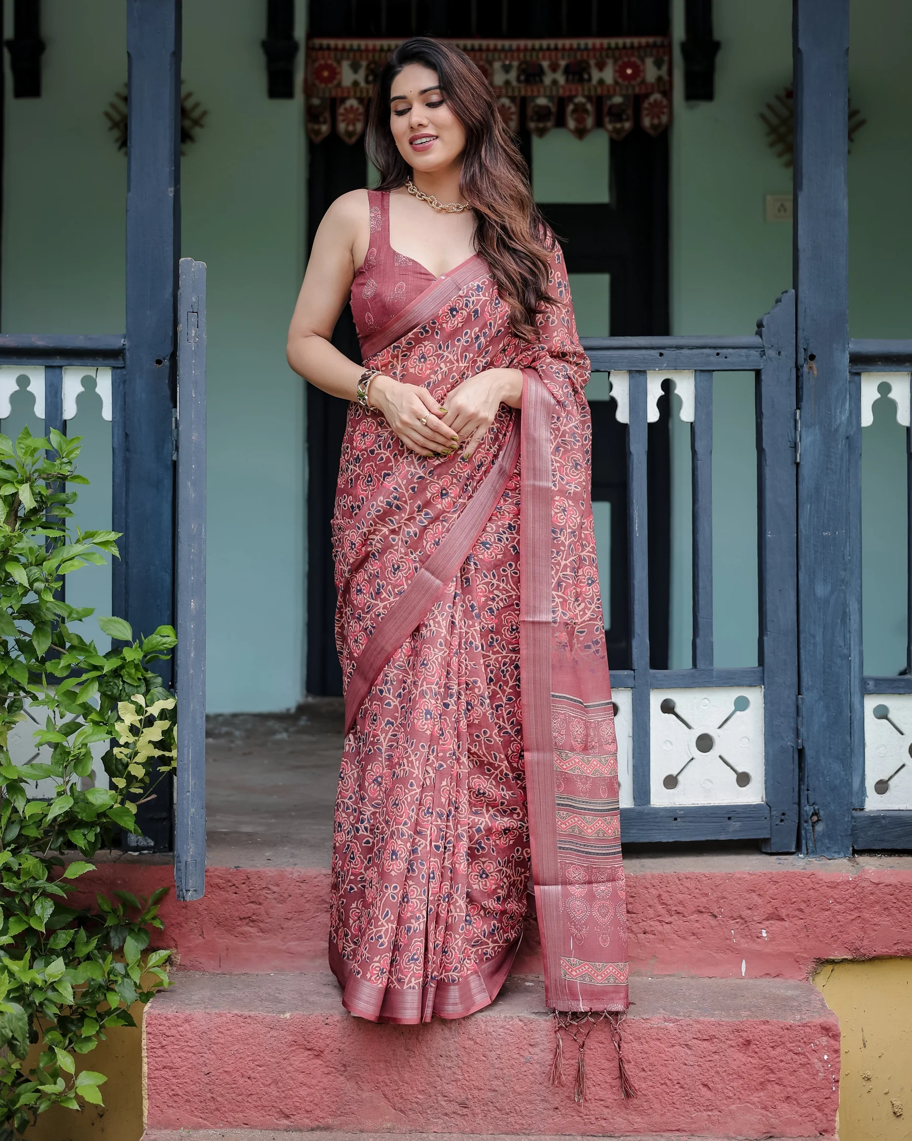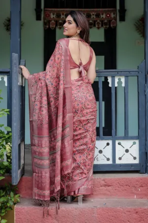 This beautiful rust red pure cotton linen saree features an intricate floral block print in shades of navy and cream, offering a traditional yet contemporary appeal. The elegant pallu is adorned with detailed ethnic patterns, adding depth to the design. Paired with a matching blouse, this saree is perfect for festive occasions and casual events alike. The tassels along the edges enhance the overall charm of the saree, giving it a timeless and graceful finish.