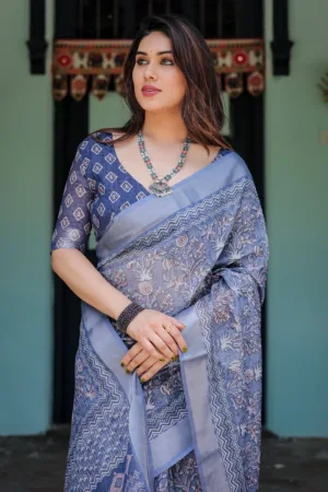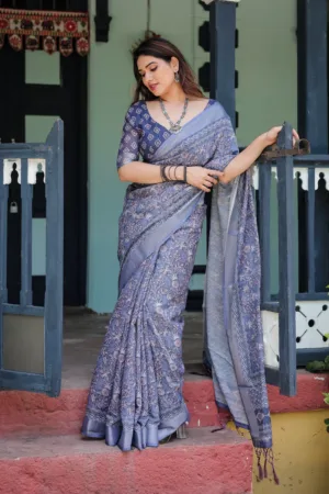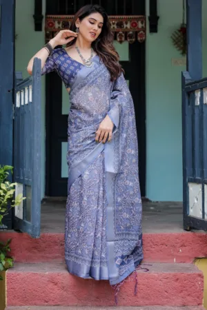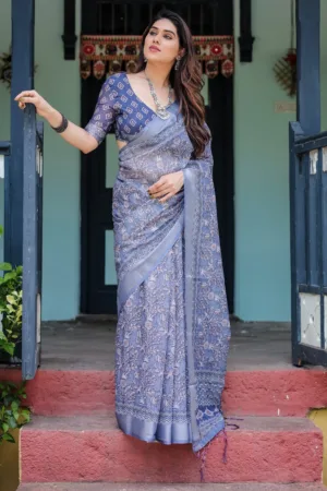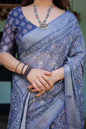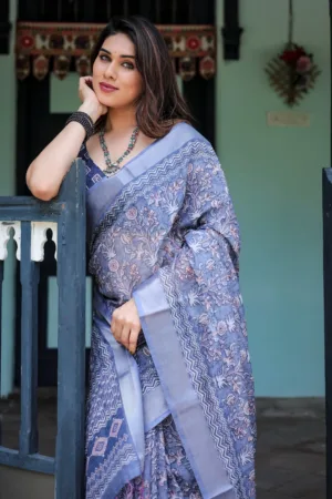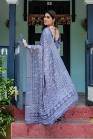 This stunning steel blue pure cotton linen saree features an intricate floral and geometric block print in soft shades of white and pink, lending an air of elegance and sophistication. The saree is paired with a matching blouse that complements the intricate patterns. The pallu showcases a detailed floral motif, adding a classic touch to the modern design. Finished with delicate tassels along the edges, this saree is ideal for festive gatherings and casual events, offering a perfect blend of tradition and contemporary style.