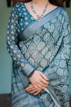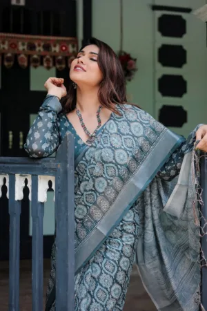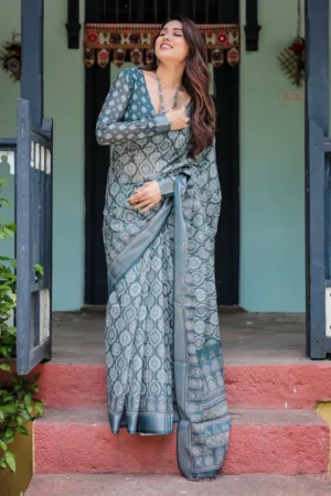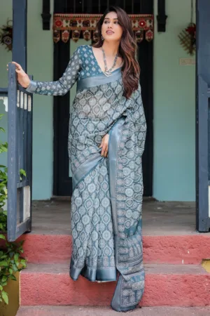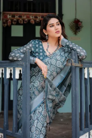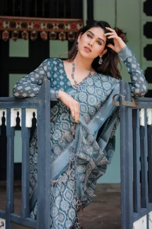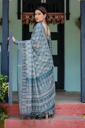 This elegant teal blue pure cotton linen saree showcases a stunning geometric block print in soft shades of white and grey, giving it a rich, intricate look. The detailed patterns across the saree and pallu lend a timeless charm, while the matching blouse features complementary motifs, creating a cohesive ensemble. Finished with tassels along the edges, this saree is perfect for festive occasions or cultural events, blending tradition with a contemporary twist.