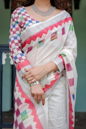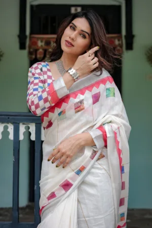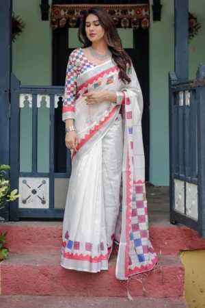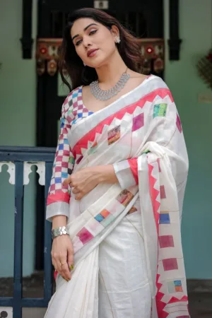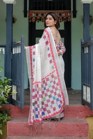 This elegant white pure cotton linen saree features a striking multicolor checkered pattern on the pallu, with vibrant shades of blue, pink, green, and yellow adding a playful yet refined touch. The border showcases a bold geometric design in red, providing a modern contrast to the traditional weave. The saree is paired with a matching checkered blouse and finished with delicate tassels along the pallu for added charm. Perfect for casual or festive occasions, this saree blends classic elegance with a contemporary twist.