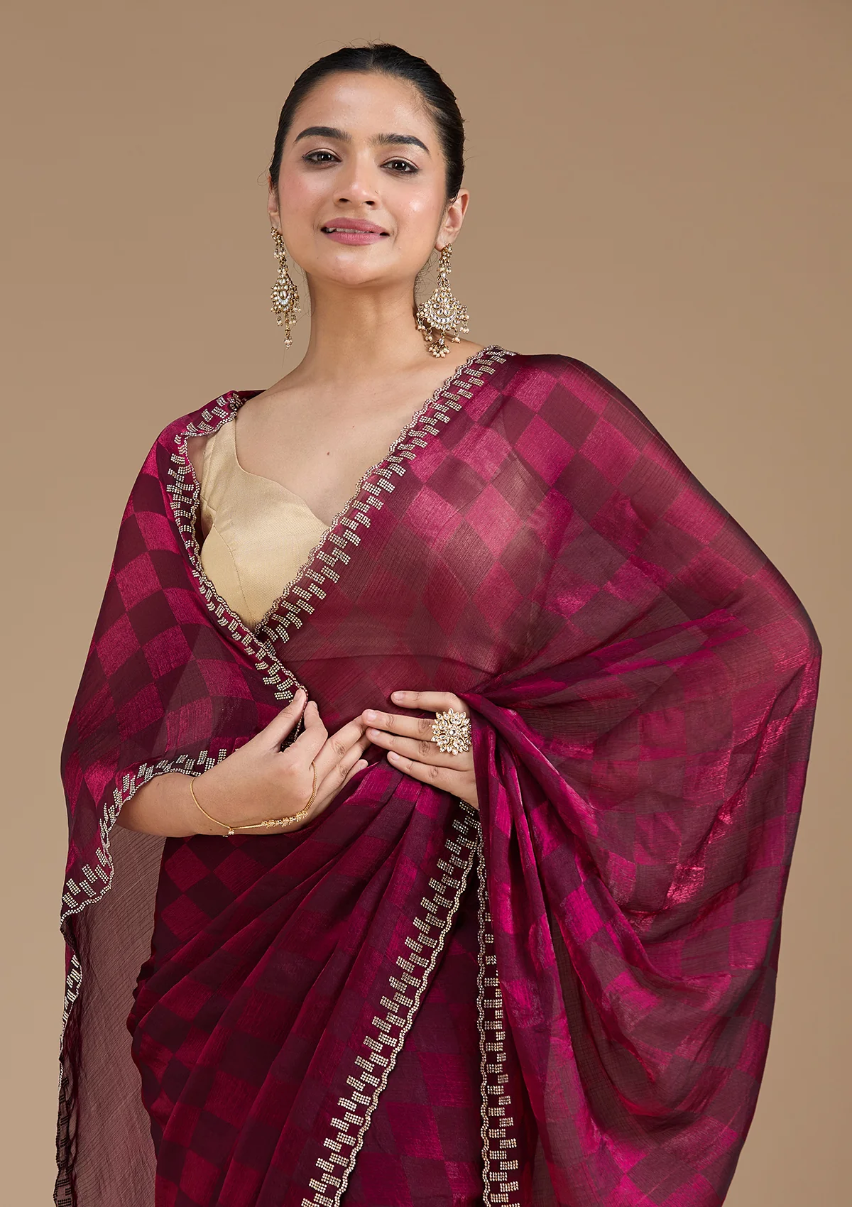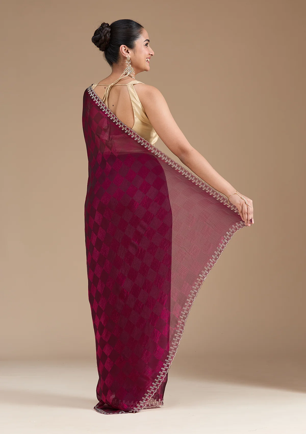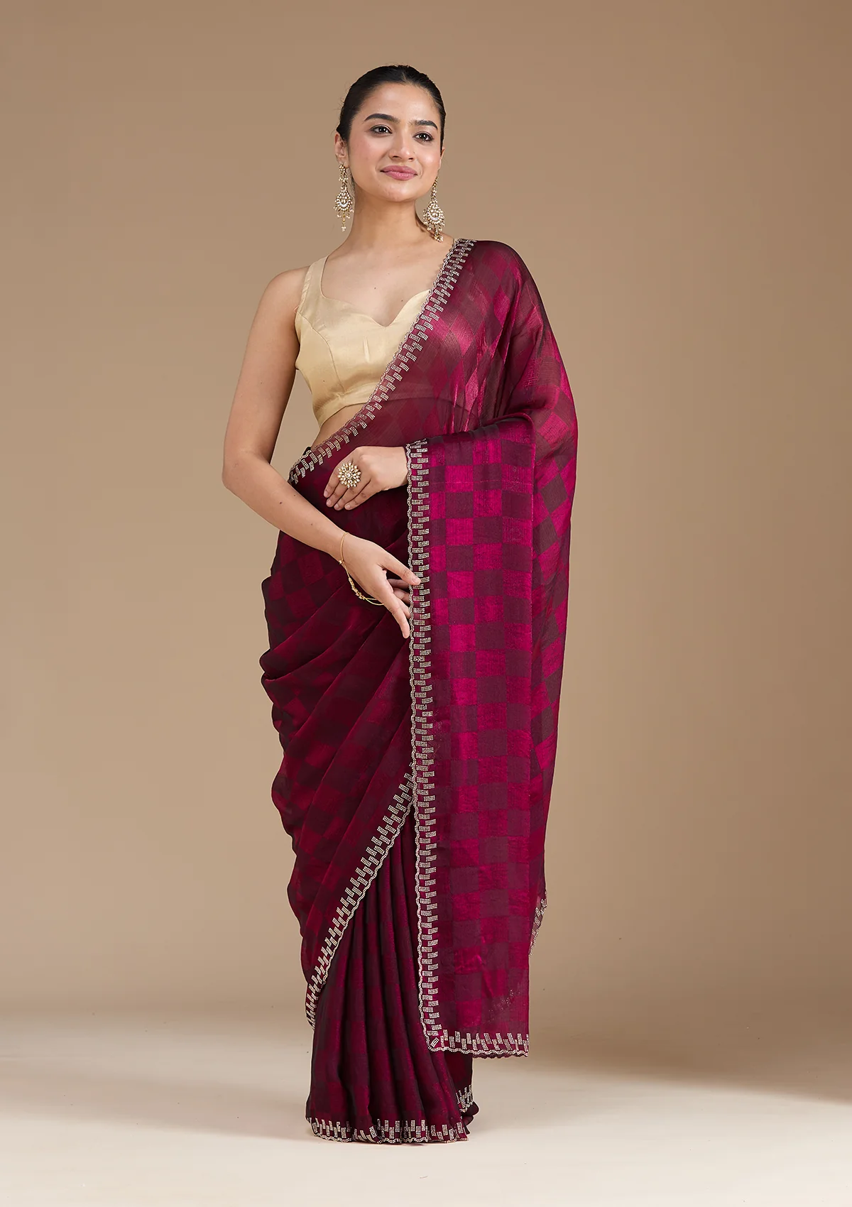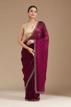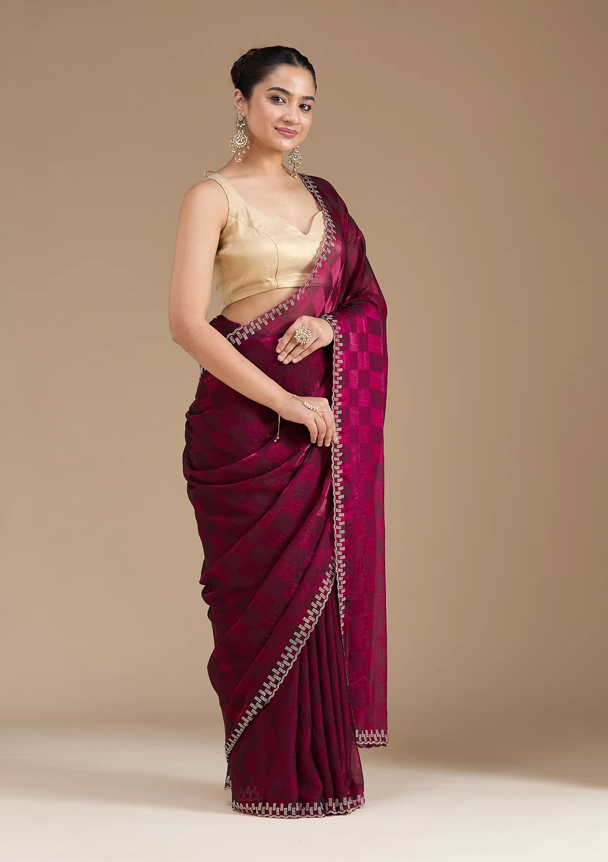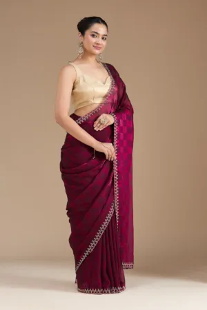 Wine Saree in Tissue fabric. The Saree is elevated with Stonework (Gold) embroidery. It comes with an Unstitched blouse. Comes with the Mimosa promise of premium quality.