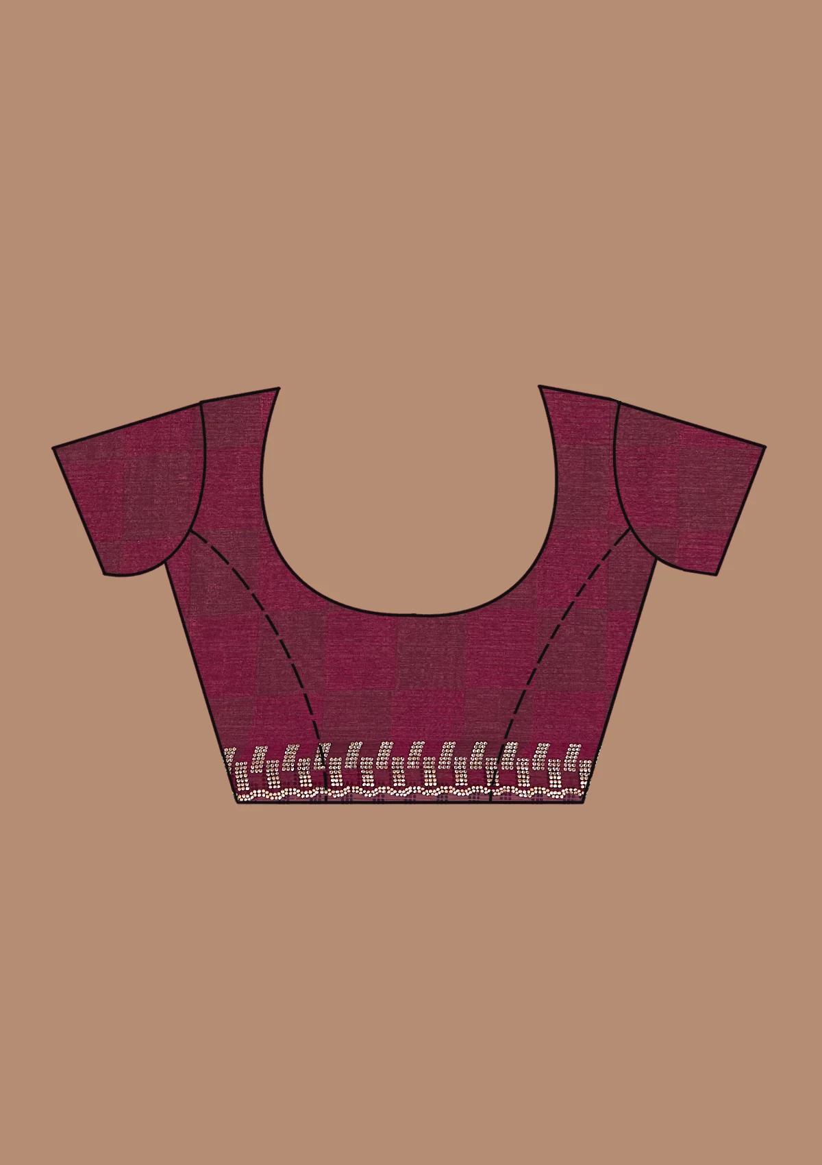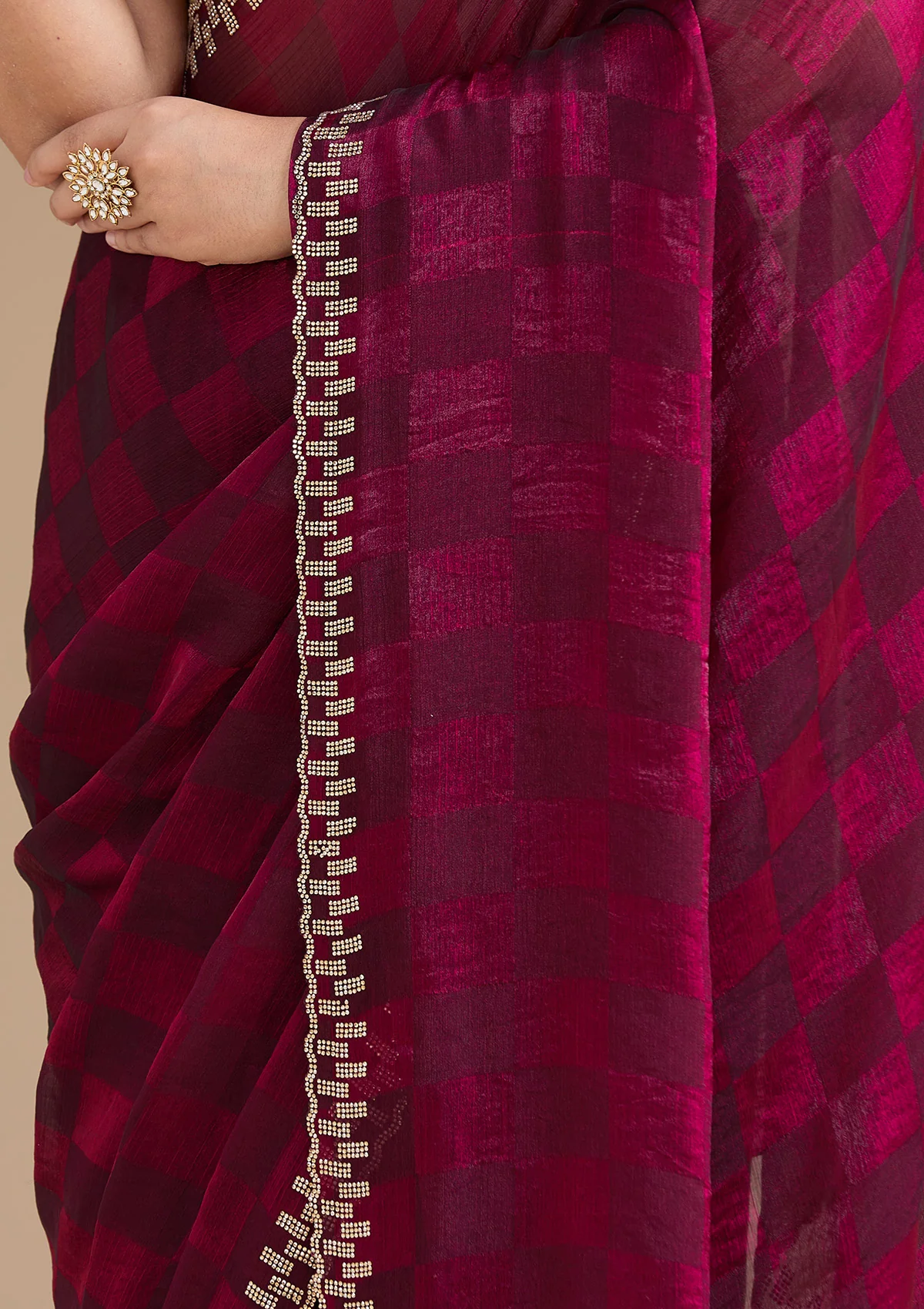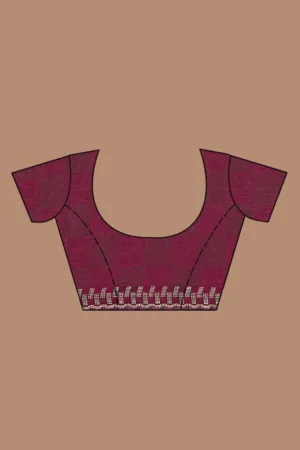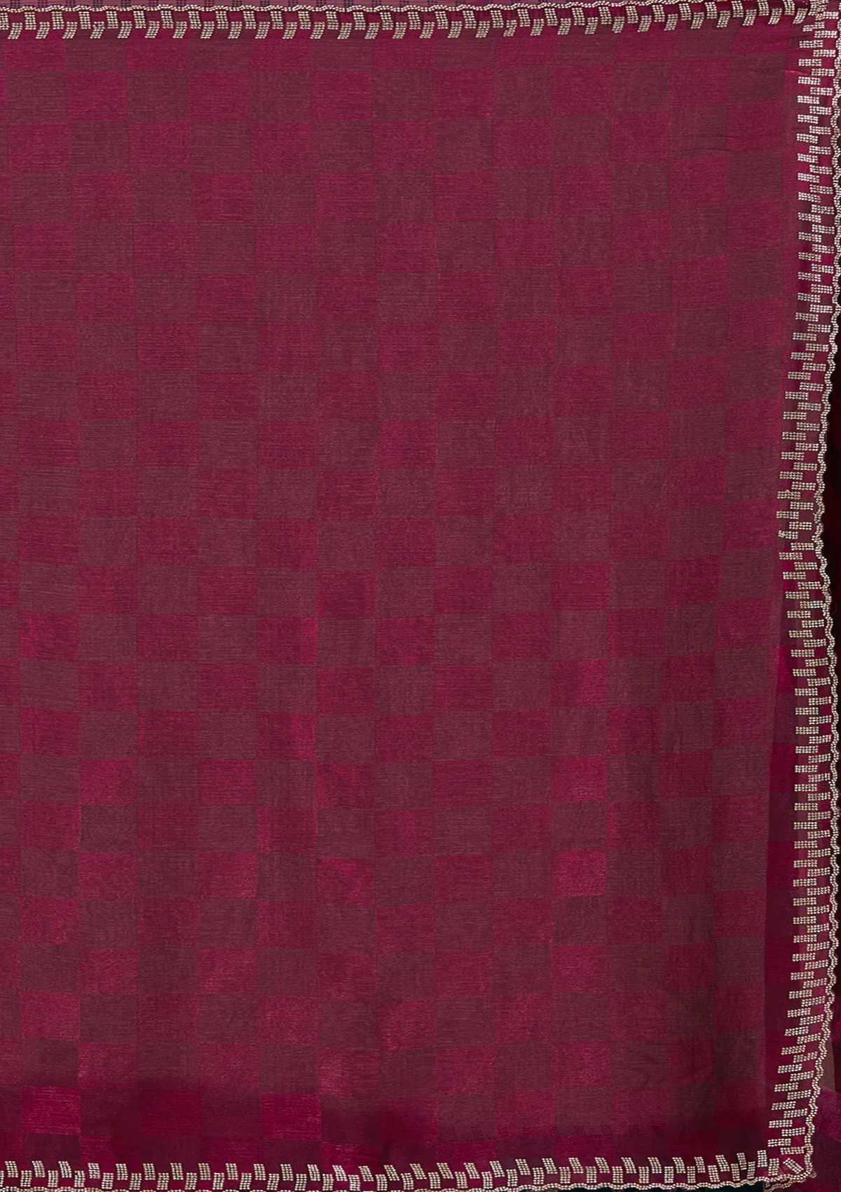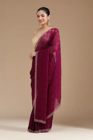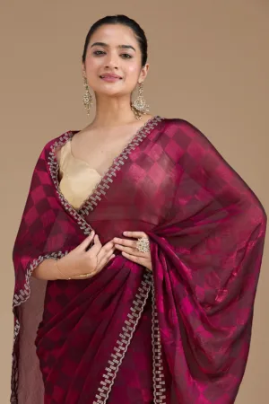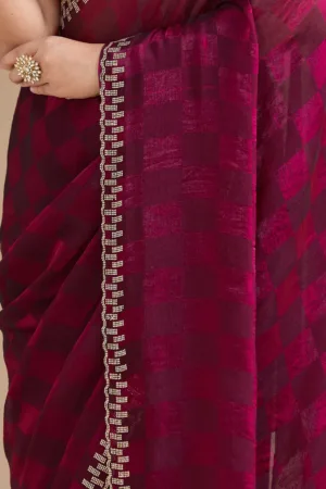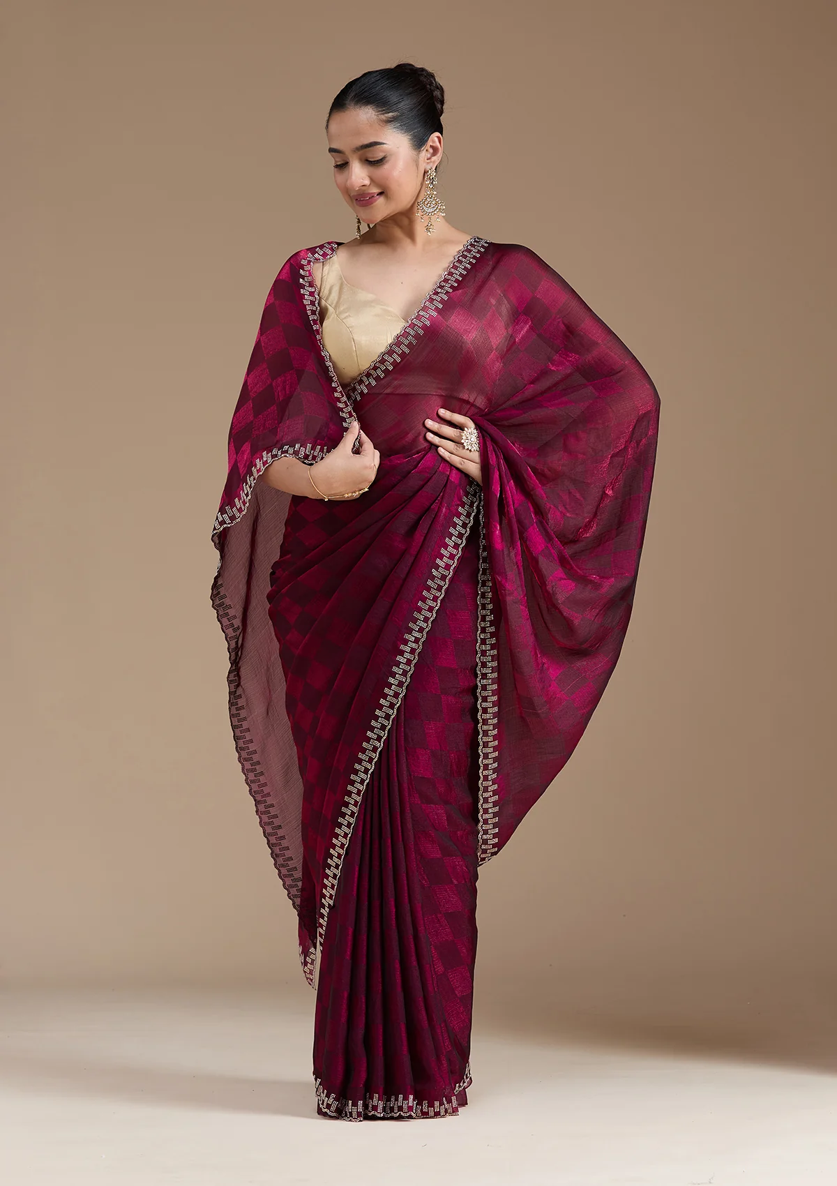 Wine Saree in Tissue fabric. The Saree is elevated with Stonework (Gold) embroidery. It comes with an Unstitched blouse. Comes with the Mimosa promise of premium quality.